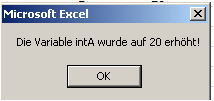 Die MsgBox zeigt: „Die Variable intA wurde auf 20 erhöht!“.