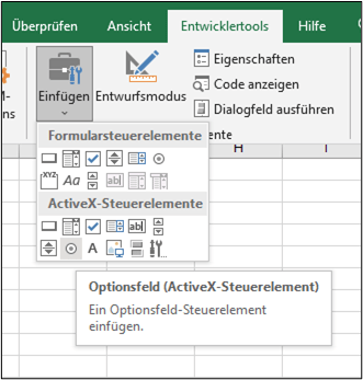 Füge zunächst zwei OptionButton in Dein Arbeitsblatt ein. Gehe dazu im Menü „Entwicklertools“ auf „Einfügen“ und wähle den OptionButton bei den ActiveX-Steuerelementen.